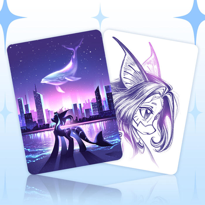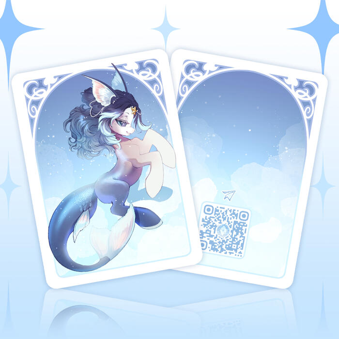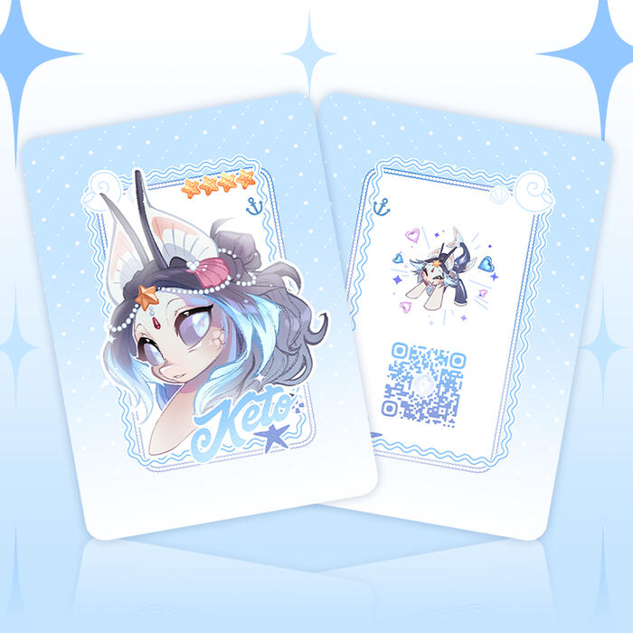 Карточка с портретом Кето в стиле стикеров с ней же. Картон имеет лёгкое перламутро-голубое сияние.